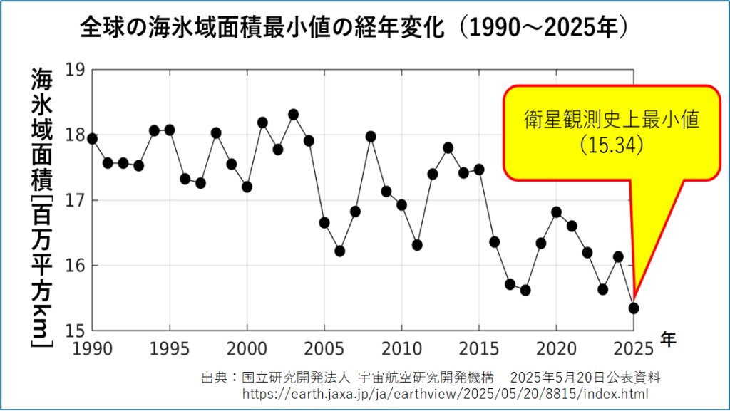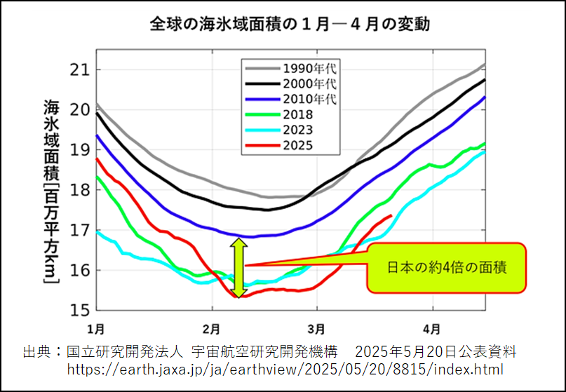 今、地球温暖化の進行による気温の上昇と、それに伴う海水温の上昇により、氷河・氷山が溶けだしています。2025年2月7日、北極と南極を合わせた地球全体(全球)の海氷域面積は、下図のとおり、人工衛星による観測史上最小値(1534万3800Km2)を記録したそうです。