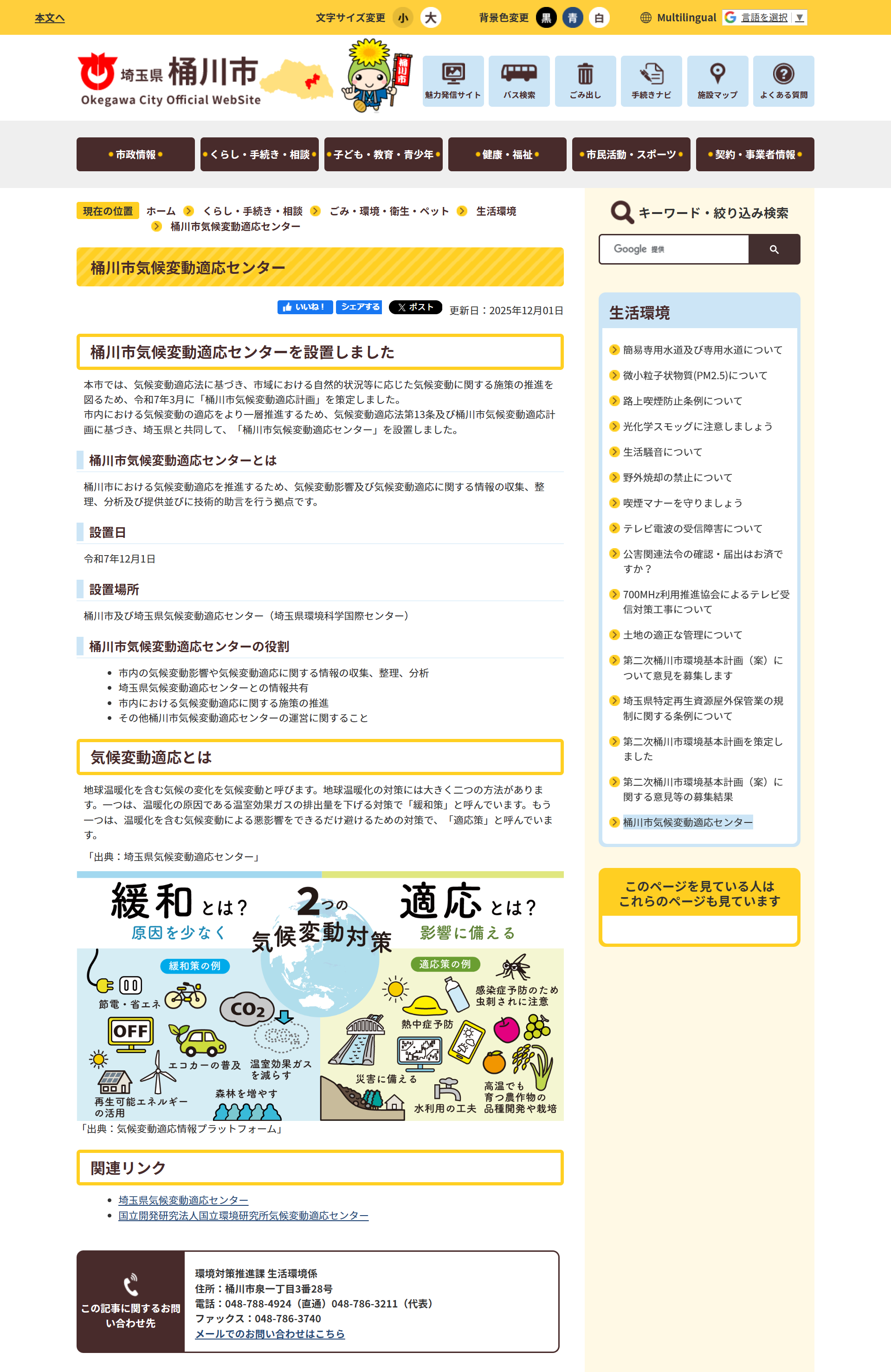 2025.12.1 桶川市と気候変動適応センターを共同設置しました 平成30年12月に施行された「気候変動適応法」に基づき、県内における気候変動適応を推進していくため、令和7年12月1日付で桶川市と共同で桶川市気候変動適応センターを設置いたしました。詳細はこちら